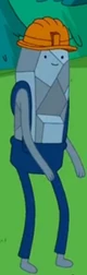 Его тело представляет из себя гранёный кусок камня. У него тонкие и длинные руки и ноги, рабочий джинсовый комбинезон и оранжевая каска на голове.