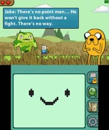 The gameplay features overworld exploration (in a top view) and dungeon combat (in a side view). Both Finn and Jake are controlled at the same time. Jake isn't feeling motivated to walk or use his powers, so he sits in Finn's backpack and digs out items. You move Finn and push Y to use his attacks, while pushing X uses Jake attacks. Finn has the ability to attack with punches or with his sword and can pick up items and enemies. Jake can shapeshift into a wide variety of things, e.g. bridges and boats and can also grow and shrink. These forms have to be unlocked be talking to certain characters and completing certain tasks. They can both perform "Fist Smash," "The Downward Sword-Thrust" and "The Twirling Death Blossom" moves by finding battle abilities. The game will also feature recurring Adventure Time characters and locations, such as the Grass Lands, the Candy Kingdom, Red Rock Pass, and the Ice Kingdom.