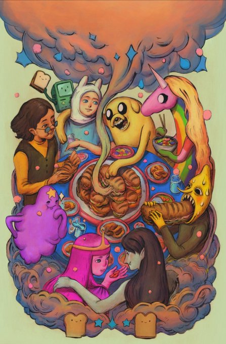 - ↑ Anderson: "The finale story would have revealed that Dr. Gross had been offered amnesty and was secretly working in Humantown, plotting a takeover of all of Ooo. Dr. Gross would’ve created a plague to affect the candy people and something called “GO Juice” [Genetic Optimizer Juice], which was just Finn’s DNA injected into the humans to make them into adventurers too. But, crucially, it wouldn’t have made them teammates—they would’ve just been a bunch of lone wolves. So when Jake and Lady and PB and Marceline and all the rest work together, they defeat the humans easily. Rather than fight Dr. Gross, [Finn] escapes and helps his friends, who are fighting everyone else. There’s a little bit of that story still in issue 5: Finn gets a scratch fighting the robot and Minerva patches it up, and that’s how they would’ve gotten his DNA. I was going to bring back Samantha the dog as a side villain. She would’ve taken over the Candy Kingdom with a dog army, in order to plunder their technology and lead a dog revolution in the Crystal Dimension, but really she was just being used by Dr. Gross. Also Jake would’ve had a family reunion, because I really wanted to write all his kids. Originally it was going to be him and Lady finally getting married. [Cartoon Network] specifically said that Jake and Lady couldn’t get married, because they were, and I quote, a “modern couple”. I still have no idea exactly what that means, haha. I had some thoughts about how I wanted to handle the humans. I didn’t want them to immediately integrate into Ooo, but I didn’t want them to be completely standoffish and weird, either. Issue 12 would’ve ended with them more or less being led by Minerva, and slowly putting themselves out there."