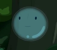 As the name suggests Bubble's first appearance was that of a bubble, a liquid sphere enclosing air or gas. It has two dots for eyes, a mouth, and a tongue. It was also capable of blushing. After being popped by Jake, Bubble's insides became one with the air, an invisible gaseous substance, but it could still communicate with BMO.