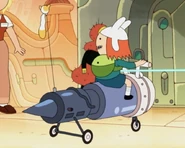 It has a blue and seemingly metallic cylindrical shape with a pointed end on the rear engine and a white rounded front housing, resembling a missile, accompanied by handlebars. It was modified to have an appearance reminiscent of Fionna and Cake, Astrid's passion. There is a flag resembling Cake in its shapes and colors tied to the back and the front panel has Fionna's face drawn on it with, with the handlebars mimicking the bunny-shaped ears from Fionna's hat.