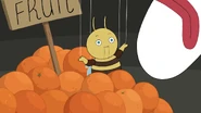 The Bee Marionette was Blue Nose 's original act at the Traveling Mini Circus . The act involved him Blue Nose walking up to an orange stand, and then having the Bee emerge from the orange pile. After he emerges he begins to figure out how to use his legs and then proceeds to dance around with Blue Nose. Unfortunately, the audience thought this to be bizarre, so he was booed away.