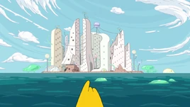 The island looks abandoned at first glance, but this is only because all of the citizens are in "tubs" playing "Better Reality", a VR game that is the purpose of the island. There is an assortment of tall buildings, which all have circular windows. The actual setting for everybody on the island would be the Better Reality server. It is essentially a blank dark space, but there are many different players and structures. BMO, known as "@MOD" in the game, has a private room, and a private dance room.