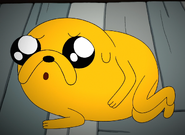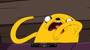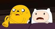 On the way home, they go through the forest. Finn and Jake goof around trying to scare each other, but then run home after hearing noises that neither of them made. They rush into the house, hide behind a door and hear something outside. They open the door and see the Blank-eyed girl is outside. They freak out, but regain their bearings, thinking that the girl might be lost and needs help. They open the door again but she is gone. Jake spots her in another window and freaks out.