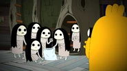 They head upstairs and try to rationalize what's going on. Finn calls Starchy and says that they are seeing a black eyed girl right now, as Jake goes upstairs to get a better view. BMO sees Jake staring outside the window at a blank eyed girl and asks what he's doing, to which Jake falls in fear. Starchy tells Finn that he thinks the blank-eyed girl goes by old-school vampire rules, and cannot enter the house unless she is invited in. Starchy is wrong. He then says that she may be a fairy and should be given cream in a saucer. Jake pulls a saucer with cream from the kitchen and offers it to the girl, who licks his right thumb. Jake drops the saucer and cries. Starchy then prescribes that they play the clarinet, as the girl is a haint and will be repulsed by the noise. Starchy is wrong again as five more girls emerge from various parts of the Tree fort and dance to the tune. Jake stops and the girls stop. Starchy claims that the girls are actually un-dead and will be driven away by the gaze of a chicken.