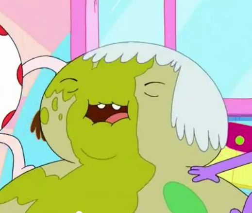 She is an elderly Candy Person who lacks both arms and legs. Her body is a greenish gray and is covered with paint splatters from the Candy Kids. Her eyes are closed, and she has slight wrinkles on her face. She has mostly short, white hair, but the hair on the right side of her head is brown (possibly because one of the Candy Kids painted it).