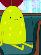 Green Gumdrop Guy is a Candy Person who first appeared in the episode "What Have You Done?." He was one of the people who fell victim to Ice King's "it's snowing" prank. In "Mystery Train," Colonel Candy Corn explained that he could have had one enemy on the train, but couldn't finish since he was "killed." This made Finn wonder who this person could have been, and Green Gumdrop Dude said that it could be him, since Finn was saying "it could be anyone." This made Finn believe that the murderer was him, and that he said that so he can get away with the murder. He was "killed" after this happened. He is seen at the end of the episode with cake in his hands, walking with Dr. Donut.