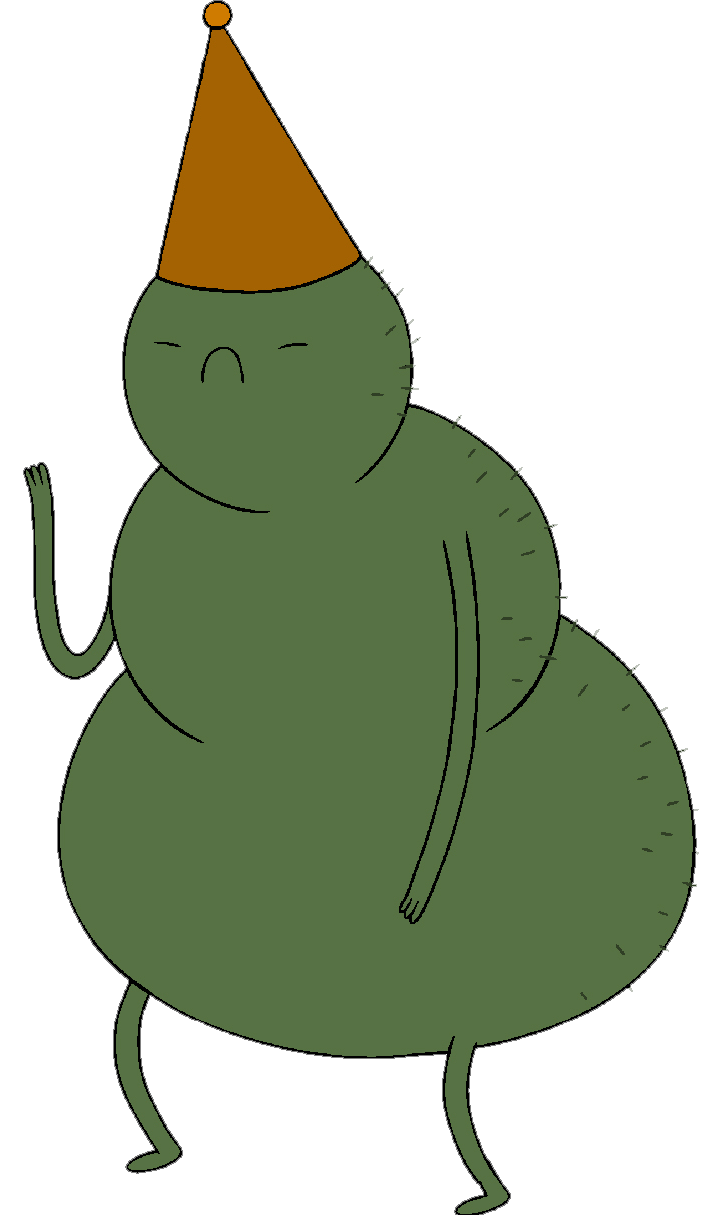 Charlie appears to be a dark green upside-down ice cream cone with little stubs of hair on his face and back. His cone acts as a hat and his body segments get bigger lower on his body.