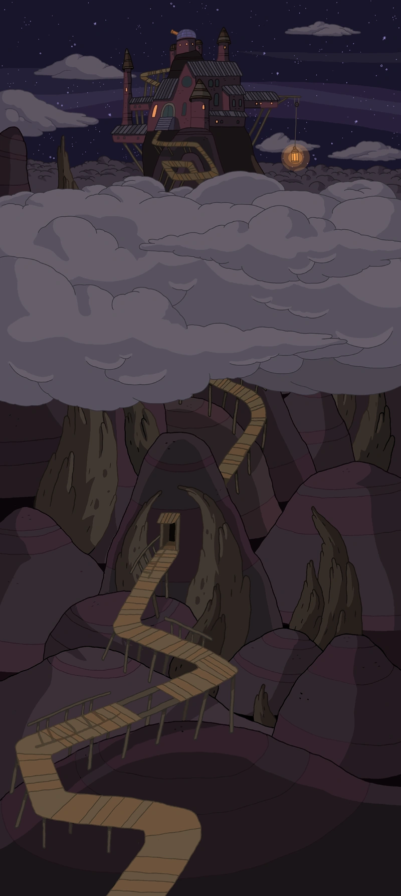 In the seen area of the upstairs there is a study, complete with a few bookshelves and a writing desk. This is the room that Shoko makes her appearance. Finn breaks through the wall of the study into another room which has a lounge chair, a piano, and two paintings with crows. The Ghost Lady (Shoko) causes the crows to fly out of both paintings (it is also possible the house itself is just haunted, or that Finn is totally delusional) and the floorboards start to break upwards at Finn. He then runs into the only adjoined room which leads to a spiral staircase. At the top of the staircase, there is a glass dome, revealing that the castle overlooks the ocean. This is where Jake reveals to Finn that it was an elaborate prank — most of it, at least.