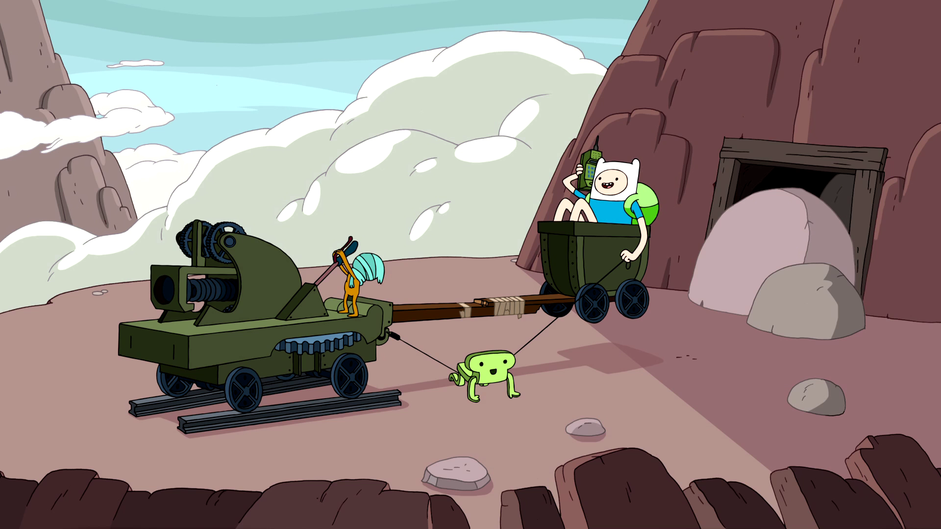 Finn once used a catapult to propel himself towards Jake during one of their attempts to perform the perfect high-five. The catapult was operated by a blindfolded individual , who was seemingly assisted by a rather odd-looking person .