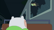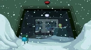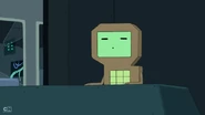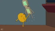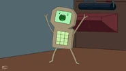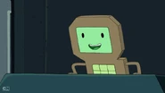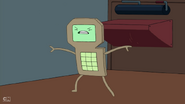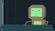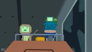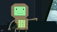 Later in the episode, Finn and Jake escape from the SMOs. They jump through a ventilation grid on the floor. They land on a tram that DMO is driving. DMO gets up and yells at them to get off of its tram. Jake says, "cram your tram!" and kicks DMO off of the tram. When the SMOs drive a tram right behind the one Finn and Jake hijacked, DMO can be spotted with them. DMO does not play any other major part in the episode.
