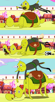 The lemon camel is also featured in "The Mountain," and appears to have high pain tolerance, as shown after falling through the roof of Castle Lemongrab.