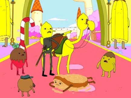 - When he dismounts Lemon Camel, the candy people murmur to themselves in puzzlement. In the storyboards, it was shown that they were saying "Who's that again?" This could indicate that Princess Bubblegum stuck him in Castle Lemongrab before he could interact with the candy people.
