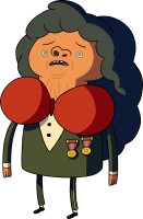 He has a greenish suit and a very big red bow-tie (which turns white after Marceline sucks the red out of it) and two medals on the bottom of his suit, possibly indicating veteran status. He has long dark hair and orange wrinkly skin.