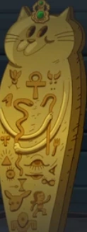 It looks like a regular Egyptian sarcophagus, except it has the head of a cat. It's golden and has many symbols on it that resemble hieroglyphics. There are two green gems shown on top of the cat head, in the form of headgear. The inside has no markings, but just plain golden walls.