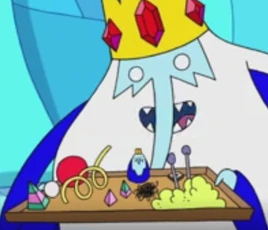 The fun tray is a tray of small trinkets that the Ice King believes are fun. In "Prisoners of Love ," Ice King brings out the tray after Finn tricks him into thinking they enjoyed the music jam. When they pretend to enjoy being with him, Ice King drops the tray in joyful surprise, scattering the contents and/or breaking the tray.
