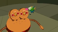 The Hamburger Monster appeared in the episode "Dad's Dungeon," along with the Hot Dog Monster in the first trial. It seems that it could have been something else that Jake wanted. As Finn notes, Jake said he wanted hamburgers, and Finn himself said he wanted hot dogs earlier in the same day, implying they might change into different objects. Jake kicks both of the heads off the monster, but like the Hot Dog Monster it lives despite significant bodily harm. As they leave, Jake tries to eat a lifeless-looking burger arm that got caught in the rubble as the door caved in, but Finn slaps him.