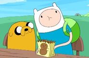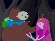 Jake meets a Bear and tries to introduce himself to him, who does not understand Jake. The Bear then tries to eat some of Finn’s peanuts, but starts choking. Finn hits the Bear’s back with the Enchiridion and the Bear spits out the peanuts he was choking on. Everybody then continues dancing. After the party, when Finn and Jake are walking home in the dark, the Bear follows them. They go back to the Tree Fort.