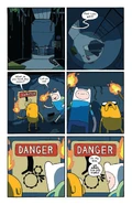 Misreading a sign warning against putting hands in machinery as a dungeon puzzle, Jake sticks his hands in some gears while Finn turns on the power to the room. Jake's arm is painfully stretched until Finn turns off the power. As they continue through the factory they discuss how easier life would be without bodies, as they wouldn't have to deal with pain or maintaining bodily health and such. They reach a missile production room and mistake another warning sign against standing too close to the missiles as a puzzle. Jake get smacked aside by a missile being moved and they continue.