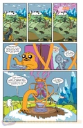 Finn and Jake go slightly too far back in time, arriving at the time of Issue 1. They travel again and end up at the original pilot episode. Finn remarks that this is back when he made everyone call him Pen because he loved pens so much, and admires his past self dancing. Jake takes Finn's sleeping bag from the past and they return to the time machine. Finn tells Jake to return the sleeping bag or he will mess up history, but Jake reminds him that this is when he lost his sleeping bag, so he is supposed to take it. This makes Finn realize that he was the one who left a note for himself in the past explaining that he should use his real name and that he borrowed his sleeping bag. He leaves the note and Finn decides to drive the time machine because it only has one use left and Jake has gone to the wrong time twice.