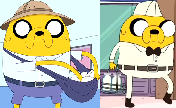 - Jake wears transparent pants spun from spider webs by pixies, as seen in the episode "Donny."