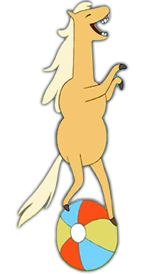 James Baxter is a horse who travels around the Land of Ooo, cheering people up by balancing himself on a beach ball, is loved by the community, respected by Finn and Jake, and usually will be whinnying his own name, "James Baxter." He is voiced by, and named after the animator James Baxter. He seems to come out immediately after someone becomes lonely, depressed, or starts crying. When James Baxter is done for the day, he deflates his beach ball, folds it into a hat, places it on top of his head, and trots away.