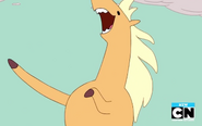 James Baxter is a tall Palomino horse with yellow-orange fur. His hooves are a typical brown color. Similar to most characters in the show, he has a simple face consisting of dot eyes and a basic mouth. He has small ears of matching fur color that are pointy and naturally stretching upwards. His mane is a bleach-blonde color and reaches mid-length on his back. His tail is the same color as his mane, and is average in length. In every scene of his appearance, he is seen with a striped light blue, yellow, and orange beachball, which he travels on. At the end of the episode, he is seen folding the beachball into a triangular origami hat. In this scene, he is shown in a pink and purple color scheme, which is likely due to the sunset.