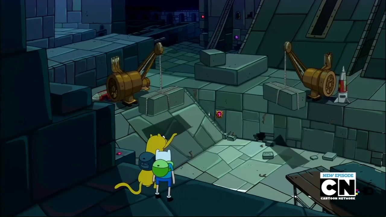 The chamber is the last location in the dungeon that Finn and Jake go to. It is the darkest room they visit. There is construction equipment scattered around, signs that Joshua built the dungeon with these tools, two missiles which can be seen next to two cranes, and a golden scarab with a jewel for a back that is on the wall. Its only inhabitant is the Evil Monster, and Jake's family sword is chained and stuck to a crystal in the middle of the room. The center of the chamber has a large pit to contain the evil monster.