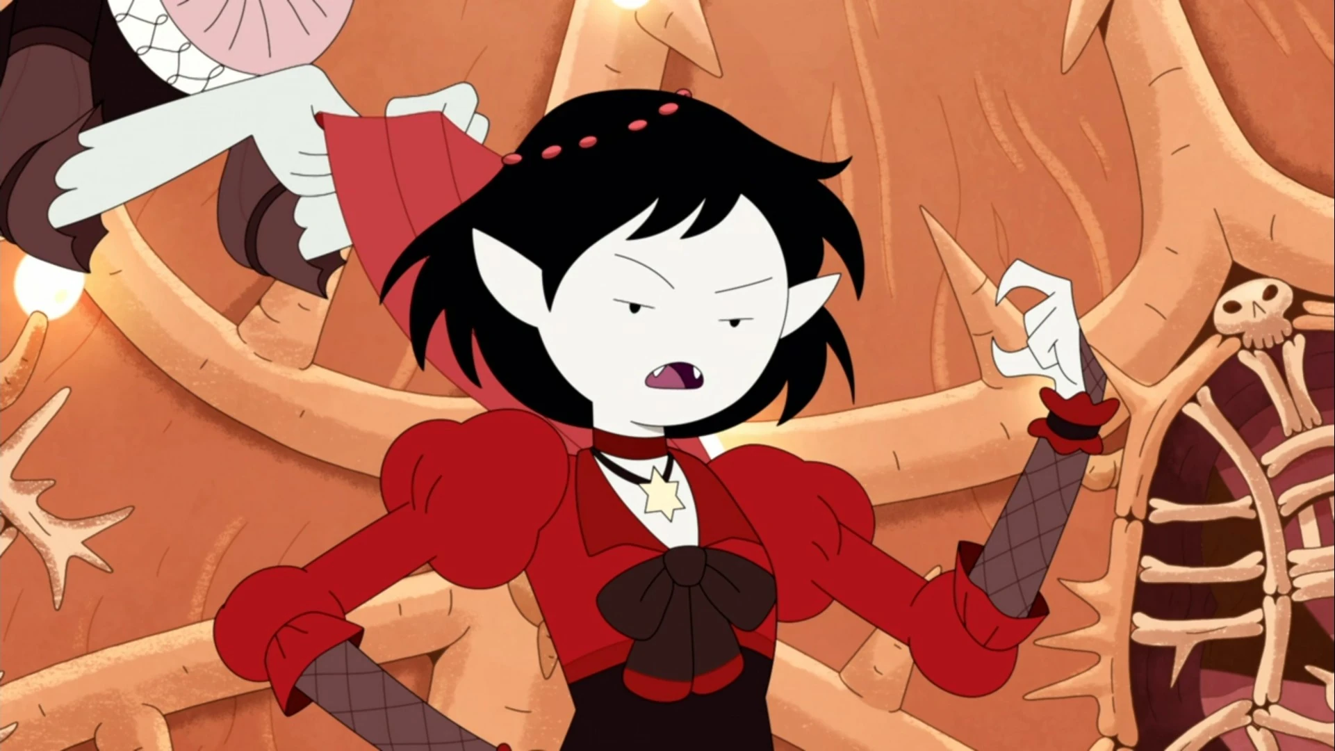 The Star and Bonnibel are shown to have a complicated relationship. Bonnie appears to be the only person other than her adoptive father whom she avoids killing. The way they act towards each other implies a long-standing relationship of rivalry that the two have, but a rivalry more based on provocation than on the need to make her another one of her victims. Although unconfirmed, it is possible that there is some kind of love in the past between the two, as much of this is an parallel to the romantic relationship of the main universe and Fionna-world versions of the two. The way The Star talked about Bonnie's eye patch could also indicate that she had one of her eyes removed in the past. She also mentioned the Vampire King seemed to acknowledge how powerful Bonnie is and that The Star and her minions shouldn't underestimate her. Despite this, she continues to toy and mess with Bonnie whenever she had the chance.