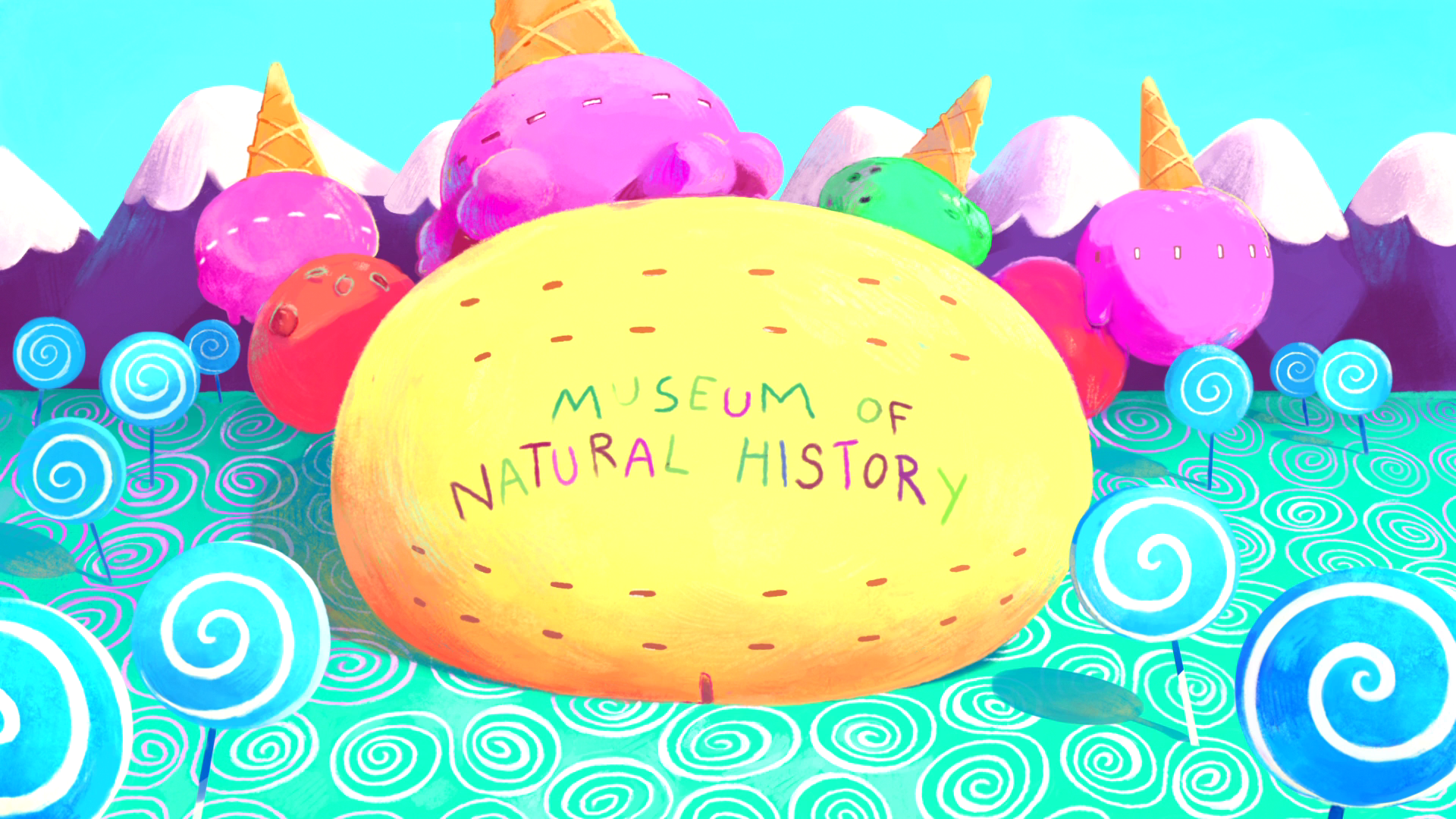 The Museum of Natural History is a huge ovoid structure. Its title, "Museum of Natural History," is placed directly at the center on the structure. It has multiple red lines over it and a small entrance. Its surroundings, full of ice creams and lollipop trees, suggest that this museum is located in or near the Candy Kingdom.