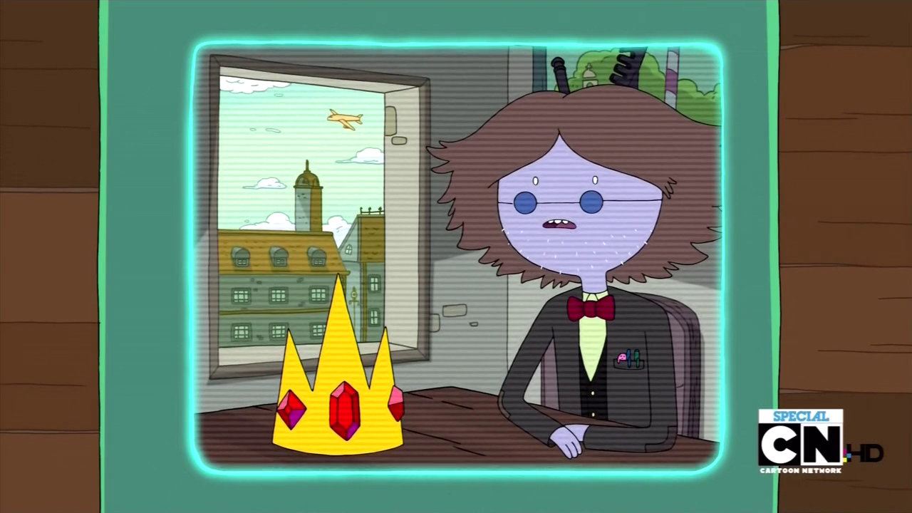 "Burning Low": When Princess Bubblegum is trying to explain why Finn cannot be with Flame Princess, on her hologram a picture of the earth can be seen that looks similar to the one on "Five Short Graybles." During Jake's dream about being promoted to president, the remains of a highway and a plane wing can be seen; however, since this was in a dream, this might not be canonical.