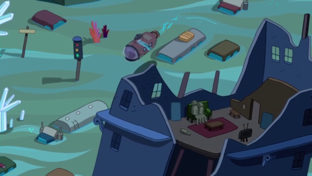 "Ocean of Fear": Underwater city ruins and vehicles appear, and a brief scene shows a damaged aircraft carrier and a stranded tank. An even briefer scene depicts two dead bodies on a couch in the remains of a pre-war living room. Finn and Jake also take to the depths in a submarine which contains a fire extinguisher, which is most likely from before the war. One can see the remaining tops of cars while they are floating over what might have been an ancient road. There are also ruins of old prewar buildings and battleships that can be seen when Jake tries to teach Finn to swim. A prewar tank can be seen stranded on the building as well. The buoy that Finn stands and the wrench he uses to knock himself out are most likely from before the war.