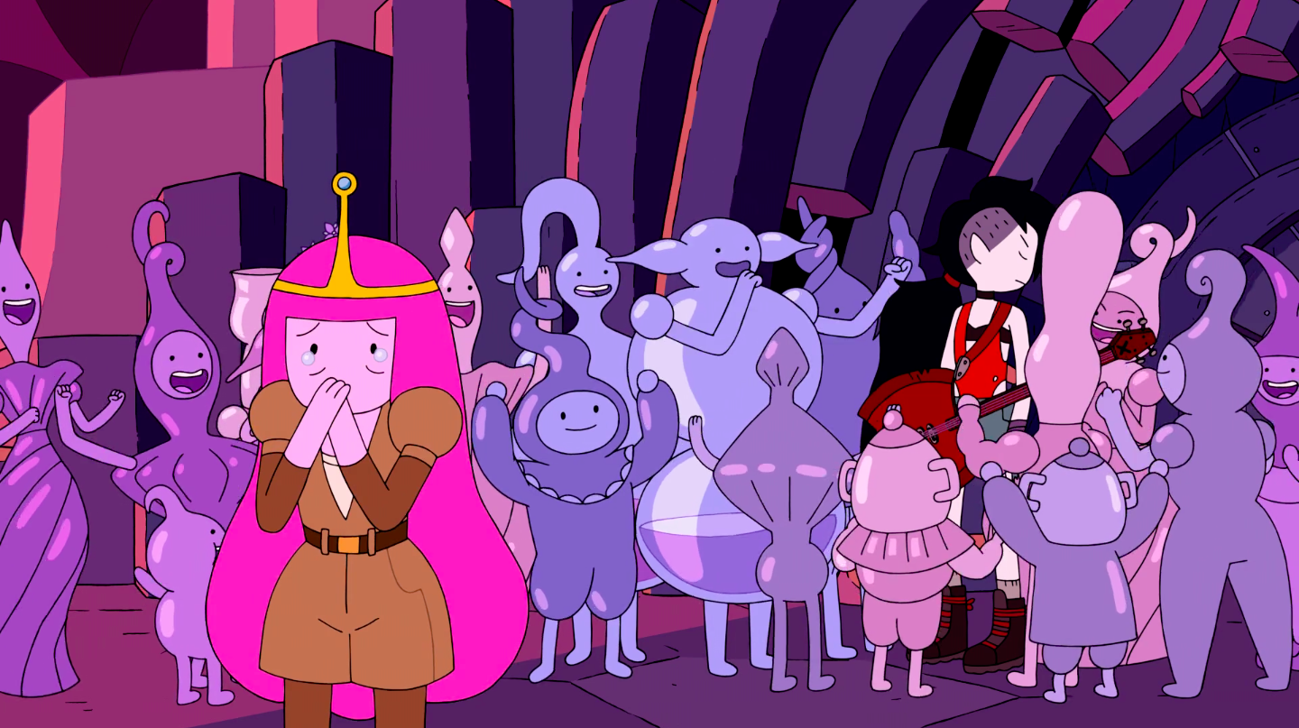 The ruler of the Candy Kingdom has to organize a thousand things at once, keeping a reliant and stable head at all times, lock down her own problems and struggles, whilst planning for the future protection of her people. Needless to say, none of this should be handled alone regardless of how mature or mentally strong the individual is. In addition to this, Bubblegum as a high-intellectual views things from a scientific or theoretical standpoint and structure things step by step. However, this often acts as a double-edged sword and complicates with the “perfection” role she has to fill already. If some unforeseen factor or miscalculation interrupts with her tightly detailed plans, she can be taken back for a moment and her insecurity reaches highest capacity. Certain examples are when she made an error at her attempt in opening the musical door in What Was Missing, failing in containing the Larvo threat twice or holding Varmints at bay. In Obsidian, the people she tried to help doubted her abilities and it was shown that even she falls subject to pressure from others. Juggling all of this simultaneously eventually manages to tear PB’s resilience. A famous example is the emotional breaking point Bubblegum reached in Varmints, where having lost the faith of her people, exiling from her home and losing her crown in an election boil up and overheat internally. PB finally starts to shed tears of sheer struggle, exhaustion and realisation that she cannot manage her dilemma and be OK. Fortunately, with the newly rekindled love and support from Marceline, Bubblegum can stop managing every disaster by herself and takes a break from the responsibility she's had since building the first Candy People.