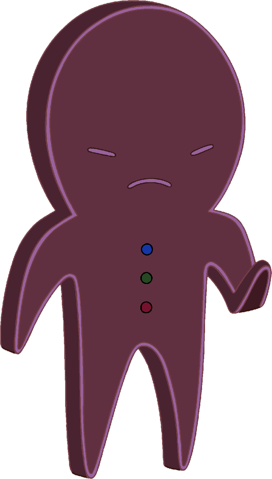 He is a large gingerbread man. He is dark brown with three dots as buttons that are blue, green, and red, and has squinted eyes. He has a white colored outlining on some of his body. His head is proportionally larger than most gingerbread men on the show.