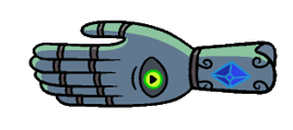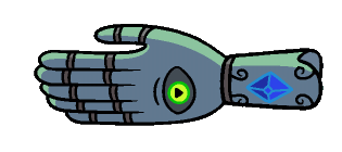 The gauntlet is silvery-blue with five fingers and a thumb. There are metal bands on every knuckle and the wrist. A blue gemstone is attached to its forearm. On the top of the hand is an eye which can open and close on its own. Like Billy, the gauntlet has five fingers and a thumb as opposed to the typical three fingers and a thumb nearly every other human and humanoid in Ooo possesses. When it is placed on Finn's arm, the gauntlet will shrink to a usable size.