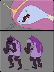 When the Lich possesses Princess Bubblegum, she has pale blue/gray skin, dirty bubblegum pink hair, black eyes with green pupils and speaks with a frail voice. In "Mortal Recoil", she asks Finn to bring toxic chemicals to her, which she consumes to turn into a giant monster. Finn manages to destroy the monster with the Ice King's help, and the Candy Kingdom's doctors manage to save the uncorrupted parts of Princess Bubblegum, transforming her into her younger form.
