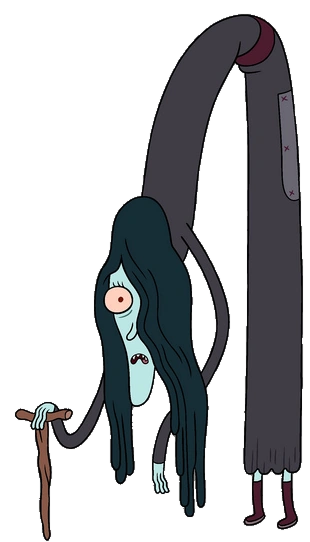 The Witch wears a long-sleeved black robe with a brown ring in the middle, and maroon boots. She is incredibly tall and thin, and this likely caused poor balance, which may explain her outrageous hunchback and her need for a cane. She has a long chin, and long black hair which covers her left eye. Despite her stature, she has tiny feet.